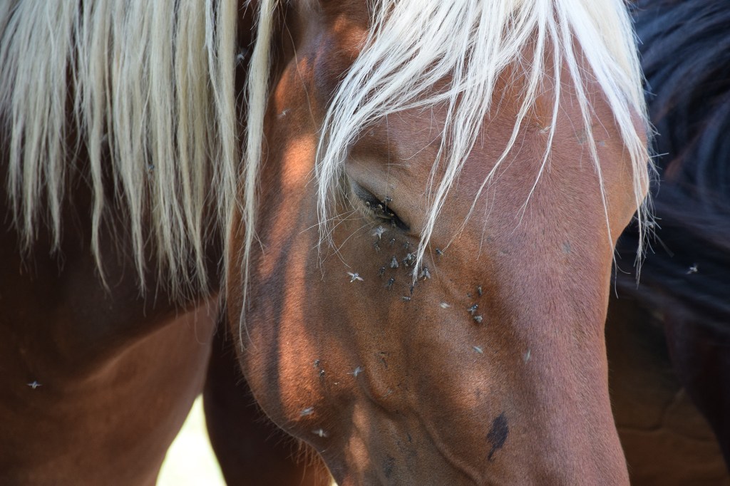 Je tombe sur des chevaux apathiques assiégés de mouches et un crapaud mort.